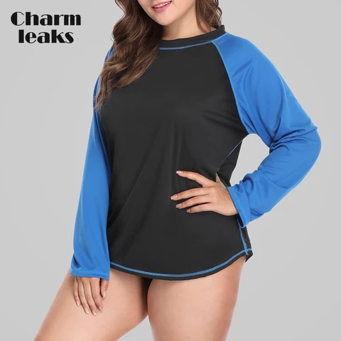 Charmleaks Women Plus Size Long Sleeves Dry-Fit Shirt UV-Protection Rashguard Shirts Rash Guard Top Colorblock Beach Wear
