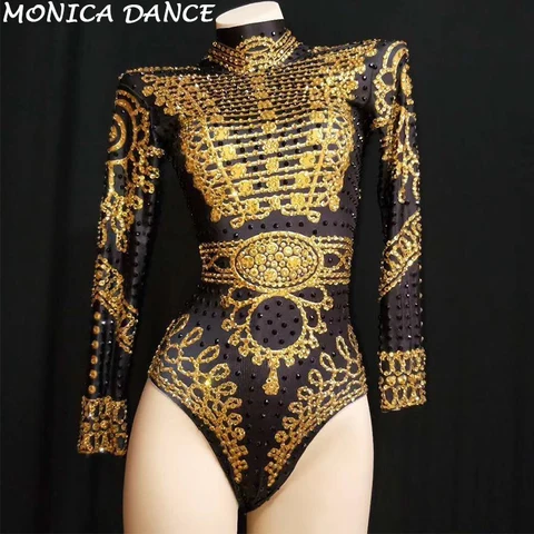 Women Sexy Black Gold Rhinestones Paint Long Sleeve High Stretch Leotard Singer Dance Costume Stage Women's Birthday Bodysuit