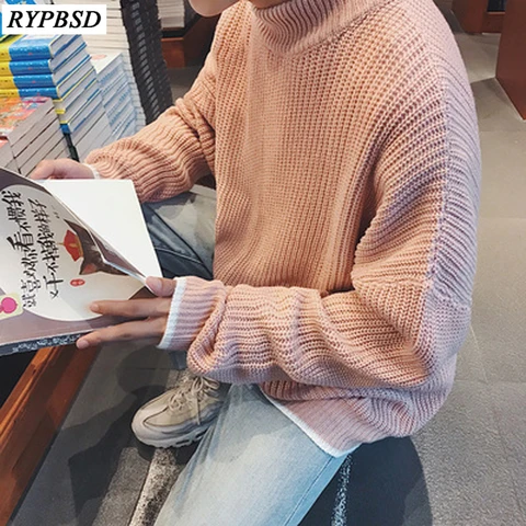 Solid Color Men Sweater Knitted O-Neck Autumn Winter Pullover Sweater Male Korean Fashion Pink Sweater Clothing 2019