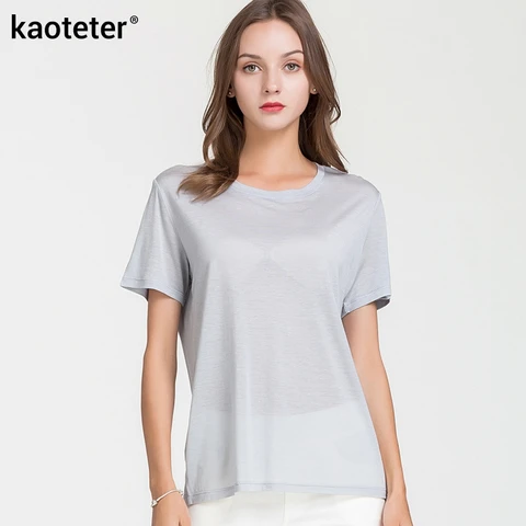 10% Silk 90% Lyocell Women's Short-Sleeved T-Shirts Tops Woman Loose Tees Shirt Women Casual Solid Female Base Ladies Shirts