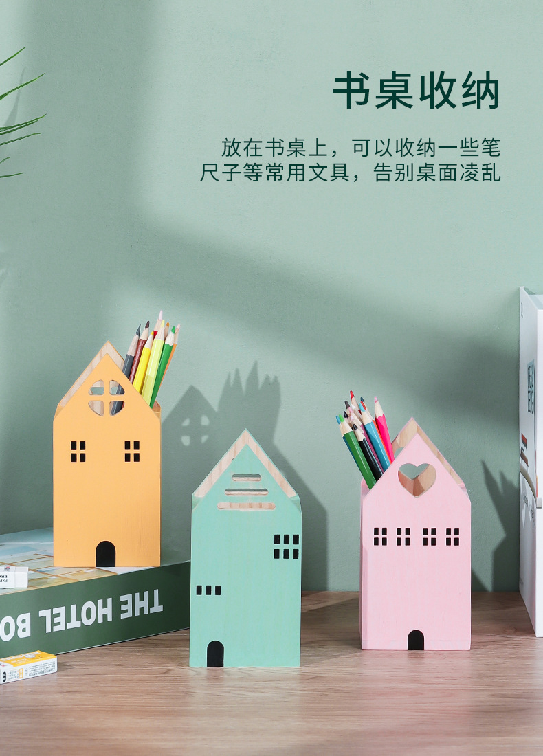 2023 New Arrival Kawaii House Shape Wood Pen Holder Desk Organizer Storage Box School Office Accessories Stationery Simple Wood
