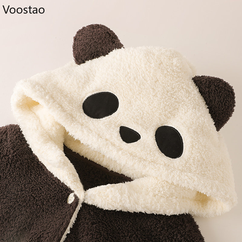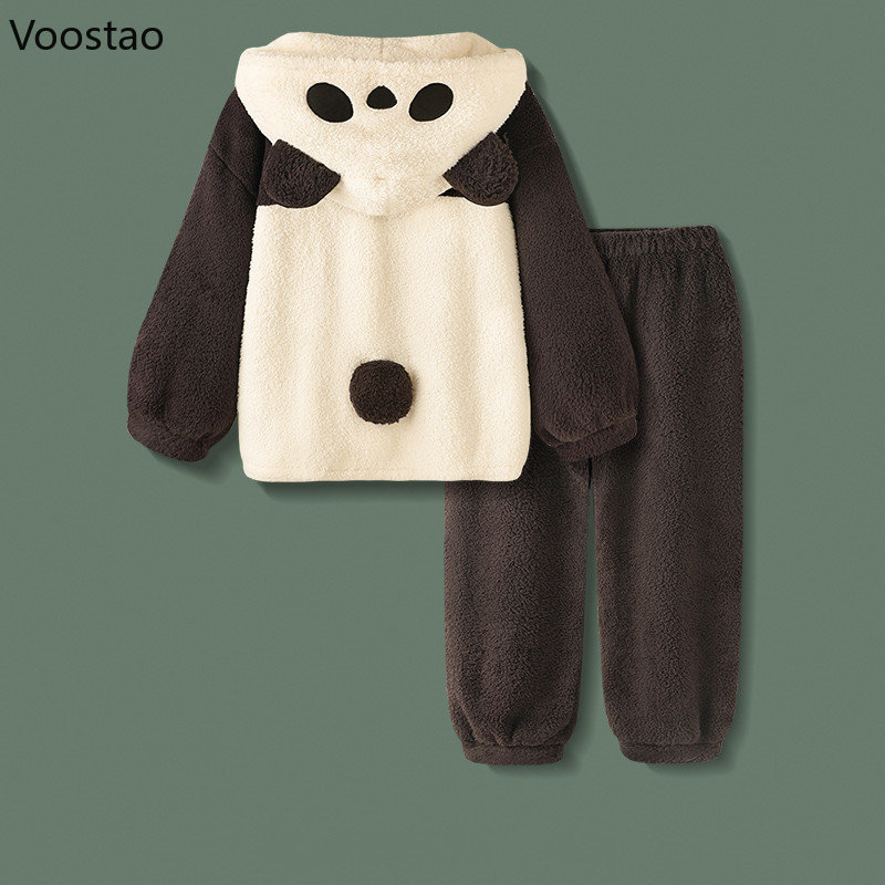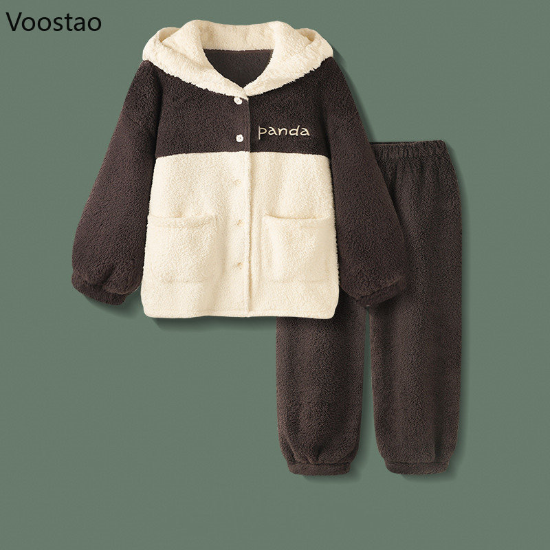 Autumn Winter Sweet Cute Panda Hooded Pajama Sets Women Kawaii Coral Fleece Warm Sleepwear Girls Casual Leisure Wear Nightwear