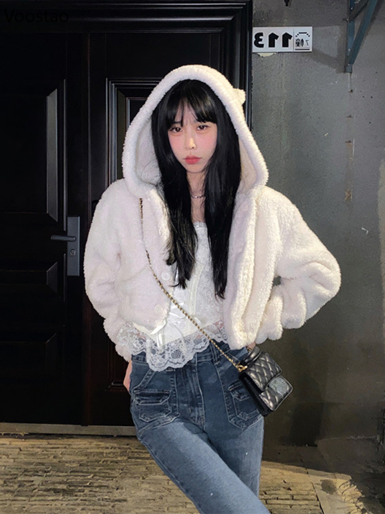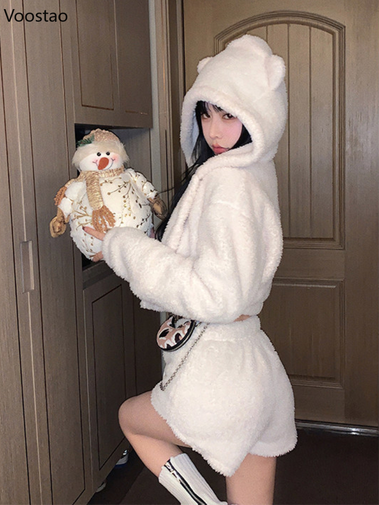 Autumn Winter Women Kawaii Shorts Set Soft Plush Bear Ears Hooded Sweatshirt High Waist Shorts Suit Girls Hoodies 2 Piece Sets