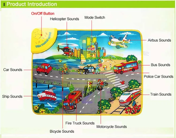 Musical carpet well use of the colorful design and sounding part to excite baby to try to explore their small world by hearing, vision and touching. Exercises baby’s crawling and walking, strengthen baby’s arm muscle by touching keys. Help baby to recognize animals and distinguish different kinds of animals’ sound. Wonderful music full exercise of baby auditory system development, cognitive instrument to help baby cultivate musical beauty.