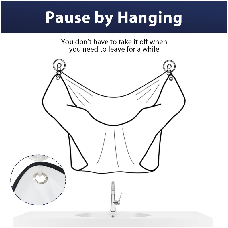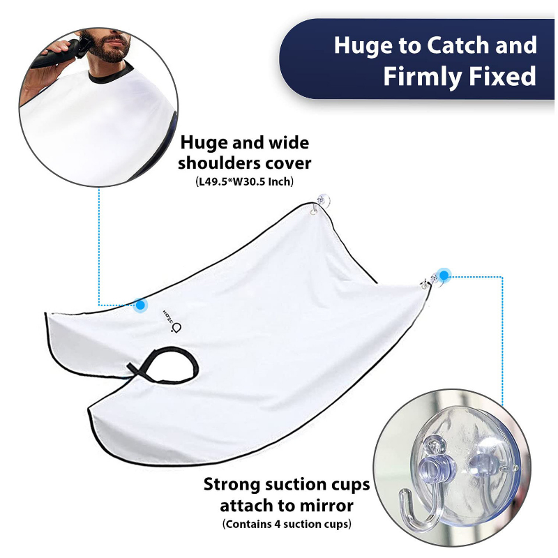 QUICK & EASY: This beard hair catcher rules the realm with a mighty fist! Using mirror suction cups and a neck collar, it’s easy to set up and just as easy to put away after you shave.