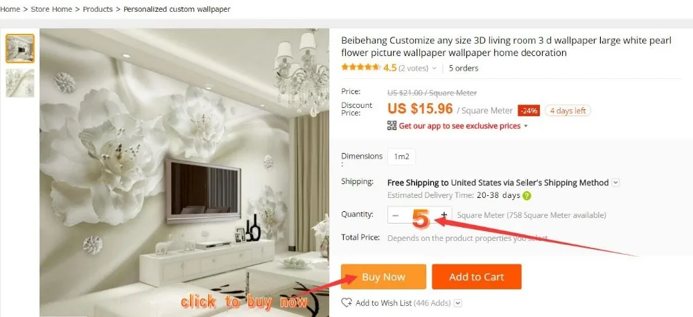 Website price is only for 1 square meter. Any size of mural wallpaper is for the whole pattern. Custom wallpapers are made up of many pieces. It’s not a whole wallpaper. It will be cut into many pieces in order that it could suit for the international shipping. Please consider well before purchasing, Thanks!