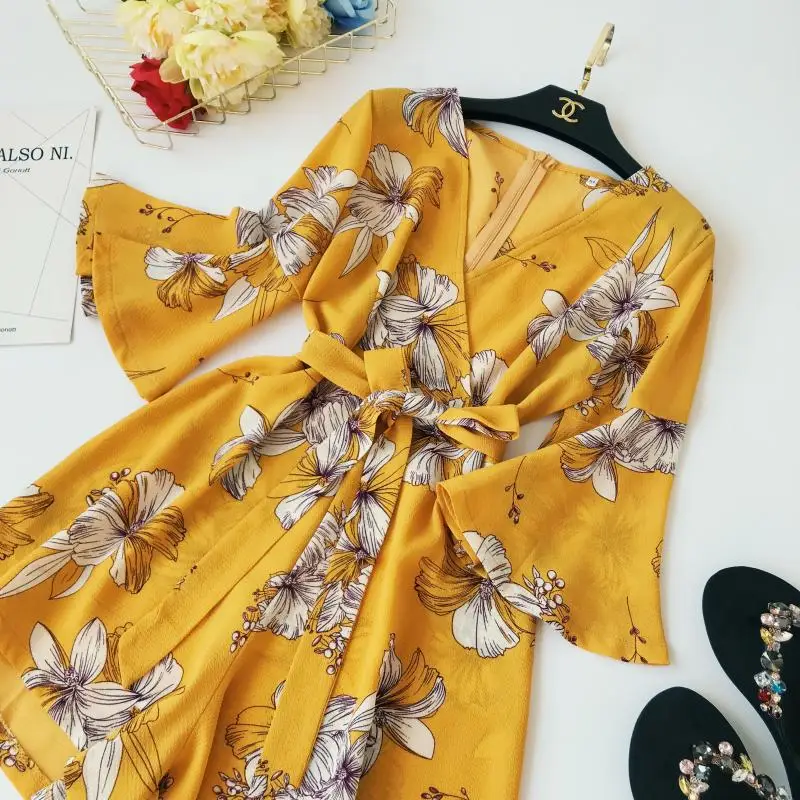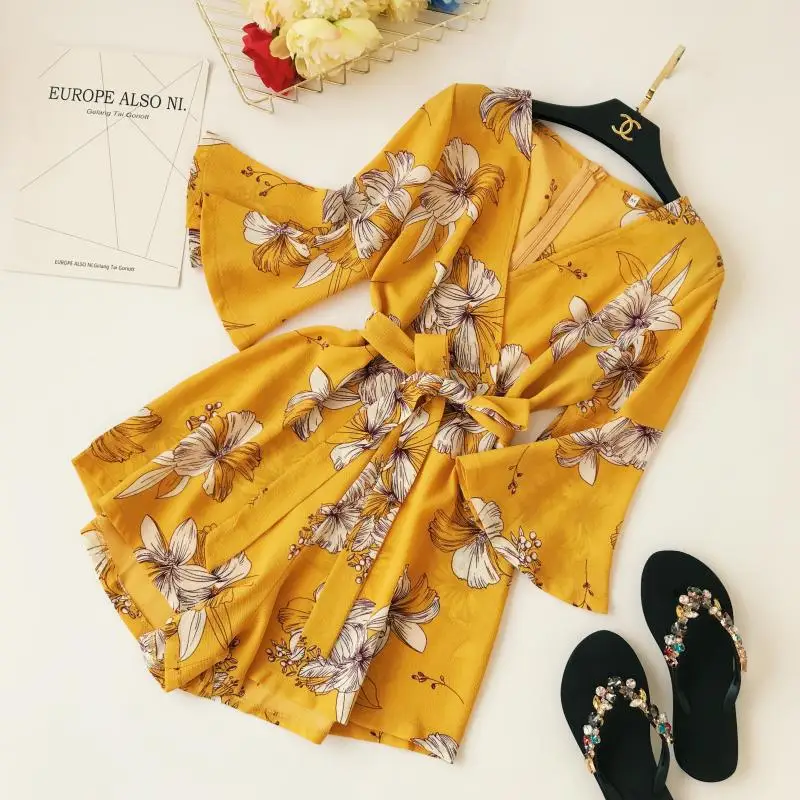 Fashion Floral Print Short Playsuits Women Casual Bow Wide Leg Jumpsuit Female Lace Up Bandage Yellow Romper Ladies Summer Beach