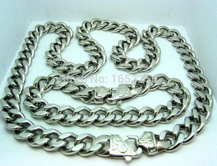 11mm / 15mm Choose Wide Pure Stainless Steel Jewelry Set Necklace & Bracelet Cuban Curb Chain Shiny Cool Clasp