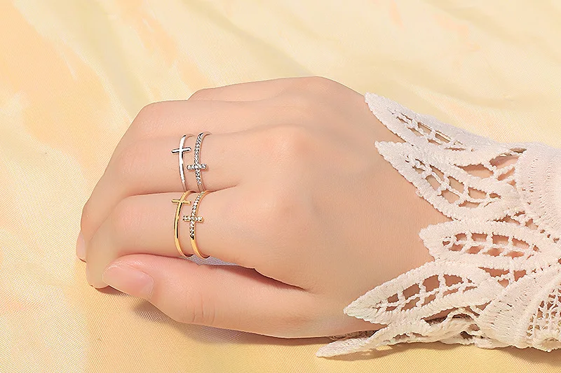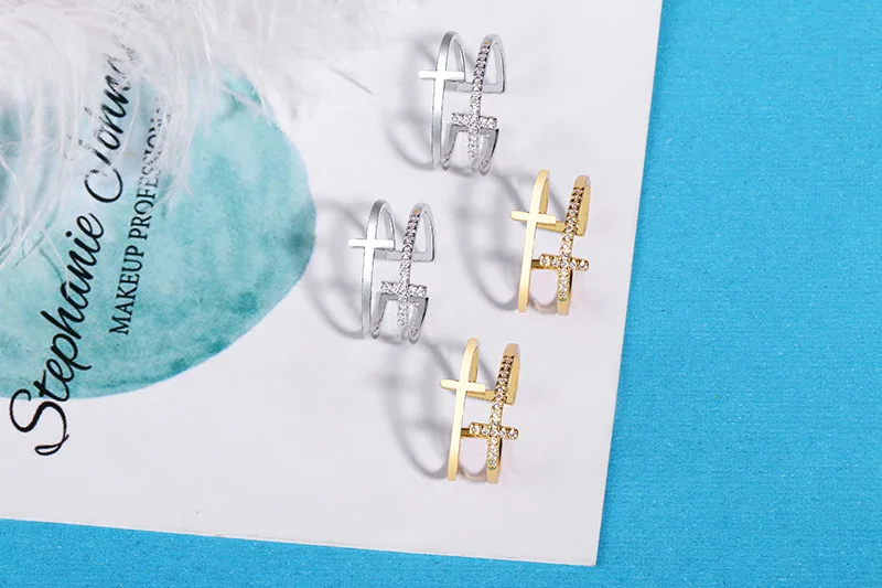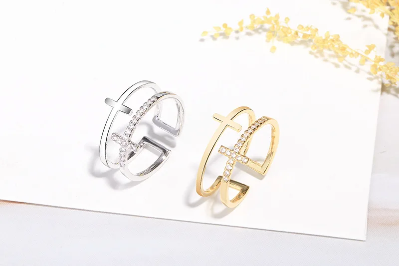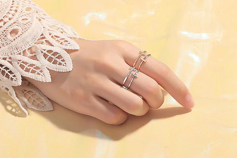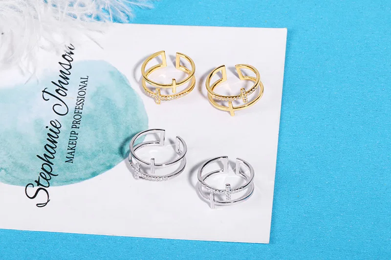 New Trendy Cubic Zirconia Crystal Cross Rings Gold Double Geometric Adjustable Ring For Women Fashion Lovely Jewelry 2020