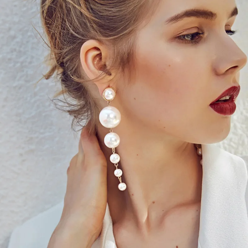 New Trendy Elegant Created Big Simulated Pearl Long Earrings Pearls String Statement Drop Earrings For Wedding Party Gift