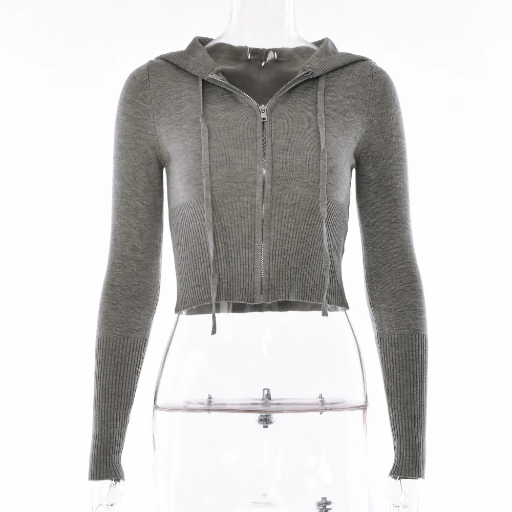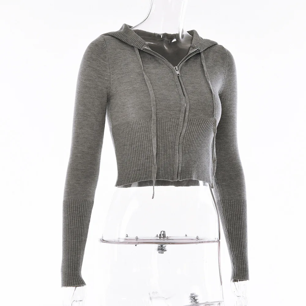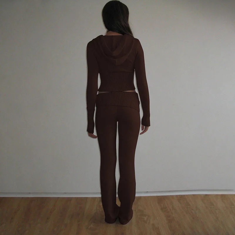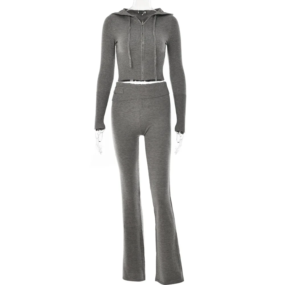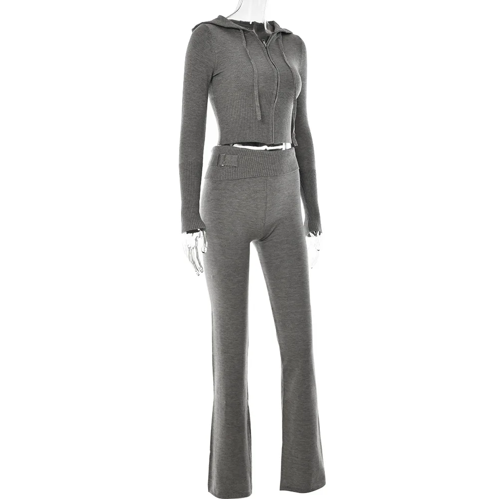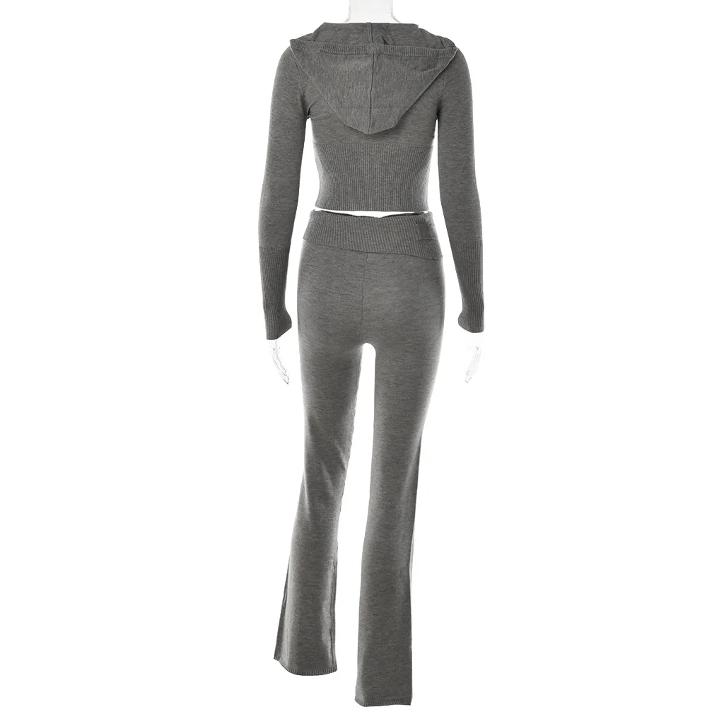 Sandro Rivers Knitted 2 Piece Sets Women Tracksuit Long Sleeve Zipper Hooded Sweater Crop Top Flare Pants Stretch Matching Suit