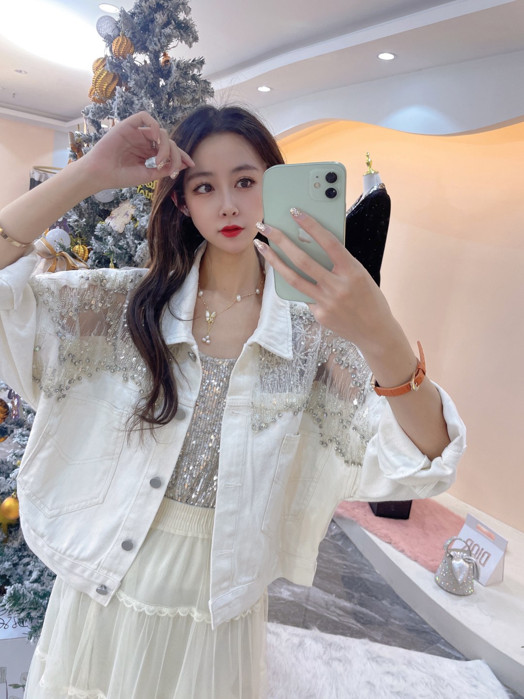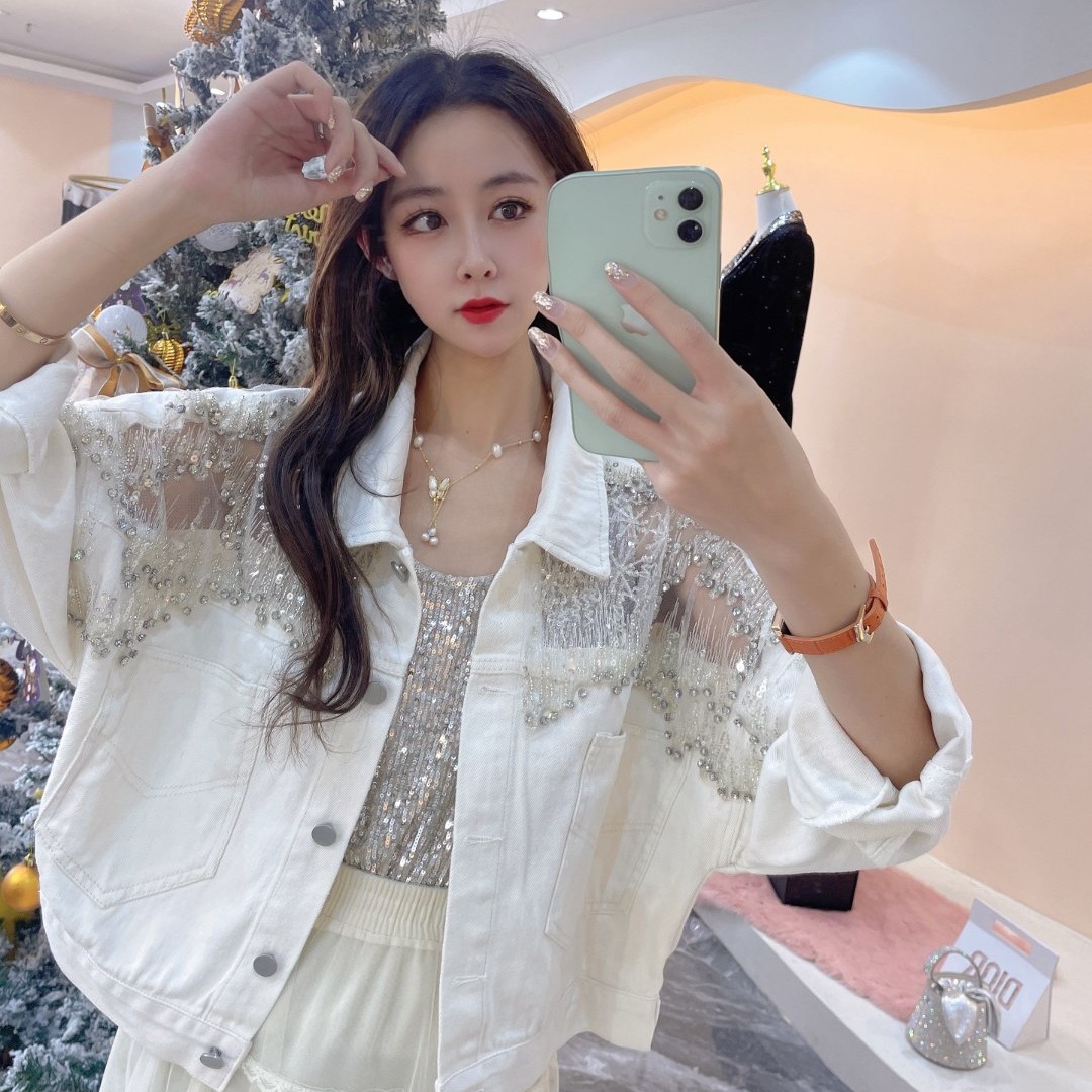 Starry Shining Heavy Work Nail Bead Splice Lace Embroidery Loose Set Diamond Short Denim Coat Top jackets