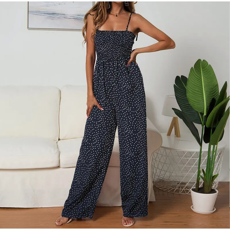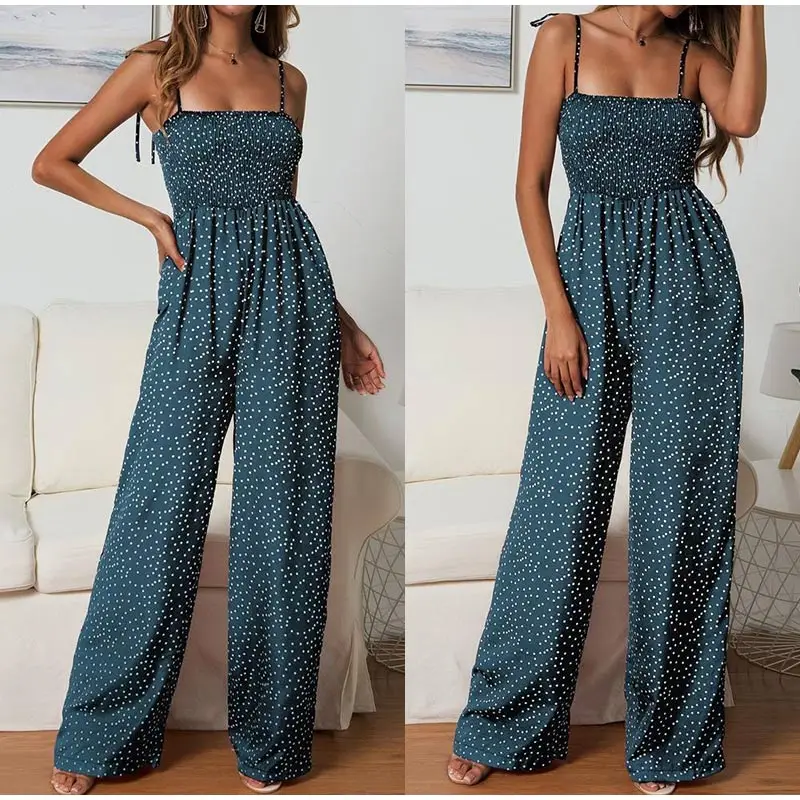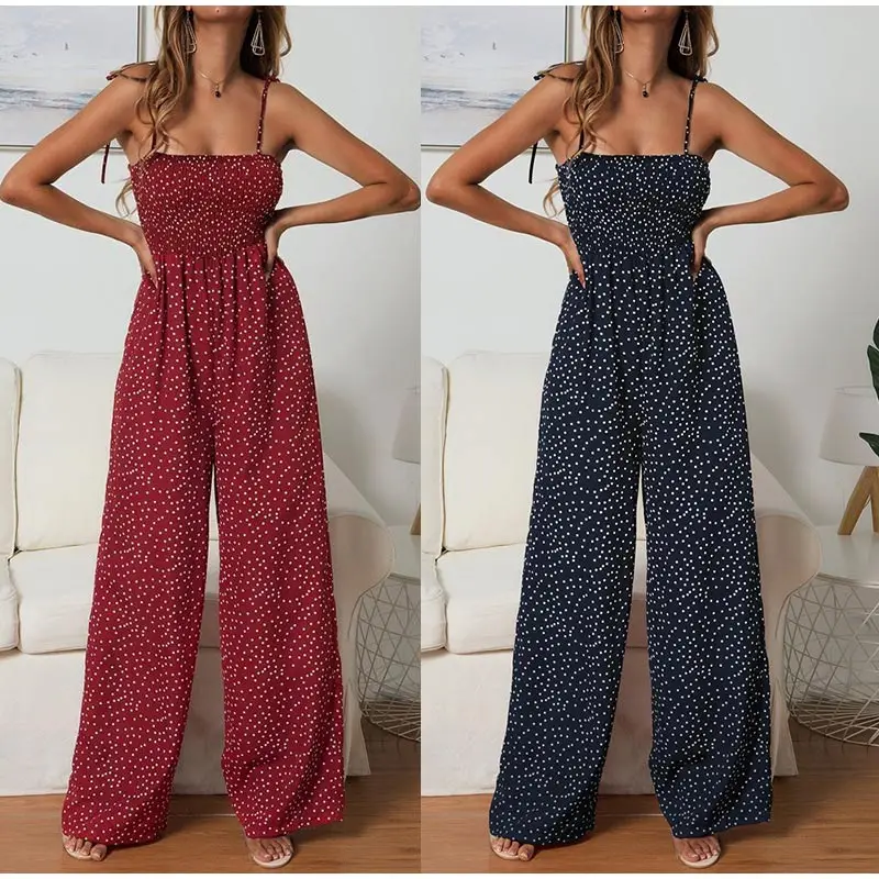 Summer Jumpsuit Women Polka Dot High Waist Rompers Boho Yellow Spaghetti Strap Top Wide Leg Pants Female Clothes Ladies 2020