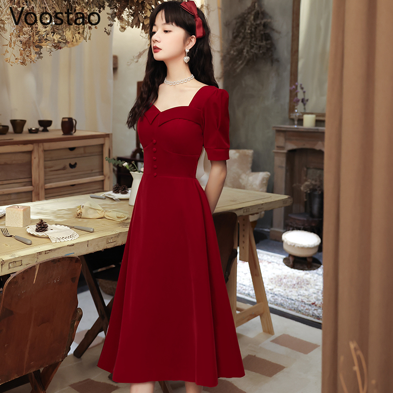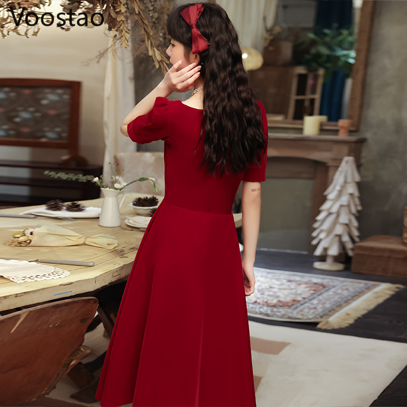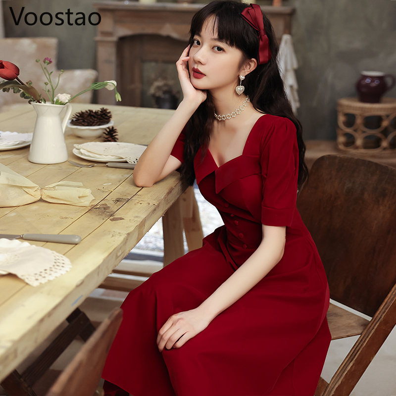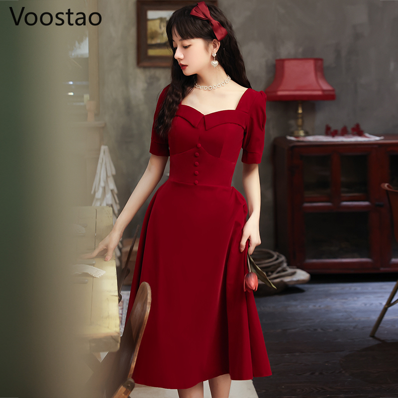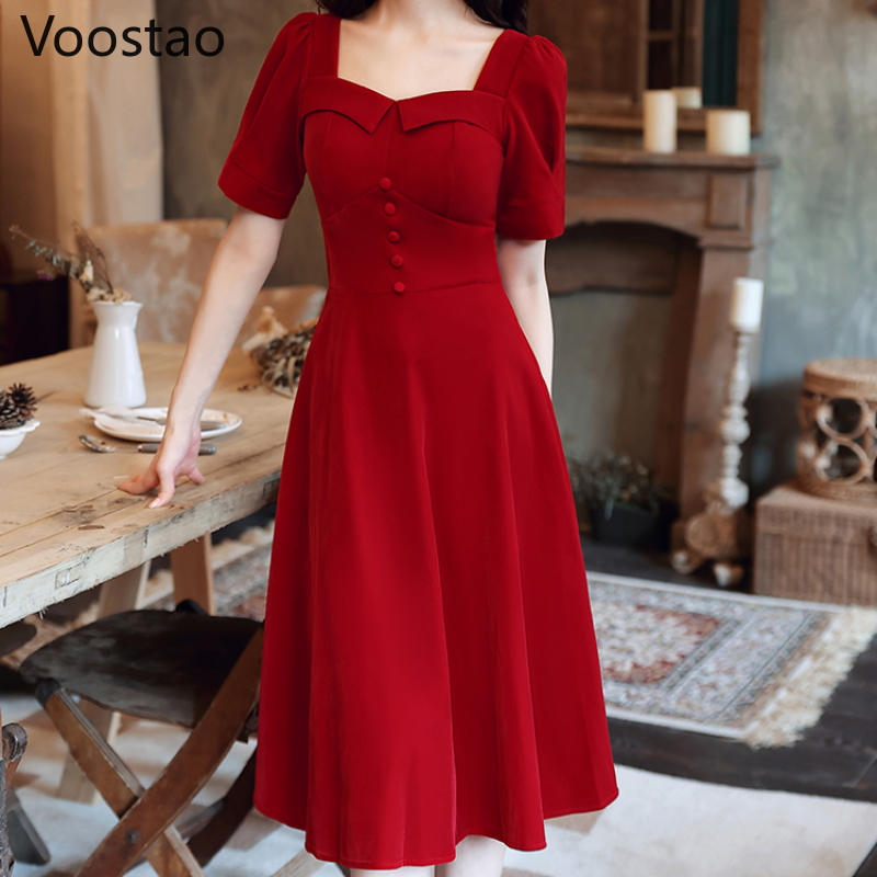 Summer Vintage Women Chic Square Collar Red Slim Party Dresses Lady French Elegant Short Sleeve Wedding Dress Female Vestidos