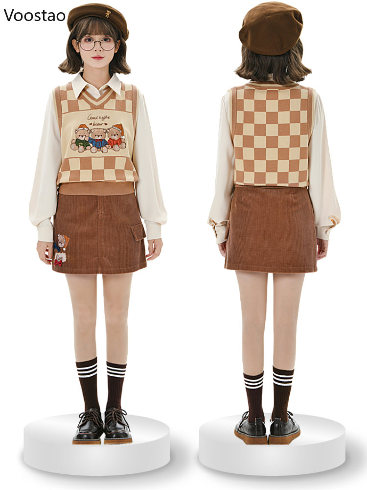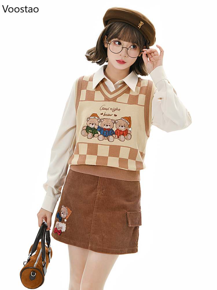 Sweet Preppy Style Cartoon Bear Embroidery Knitted Vest Women Kawaii V-Neck Sleeveless JK Sweater Spring Autumn Jumper Waistcoat