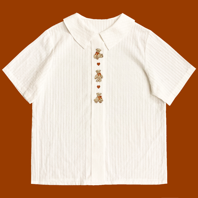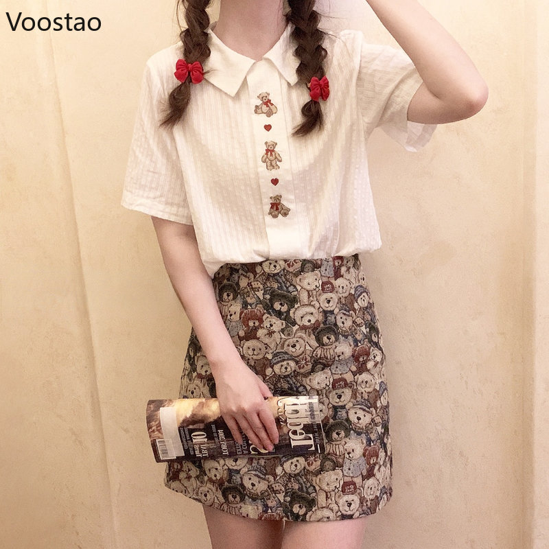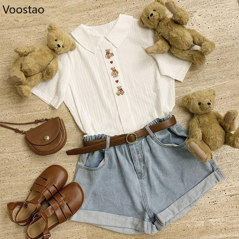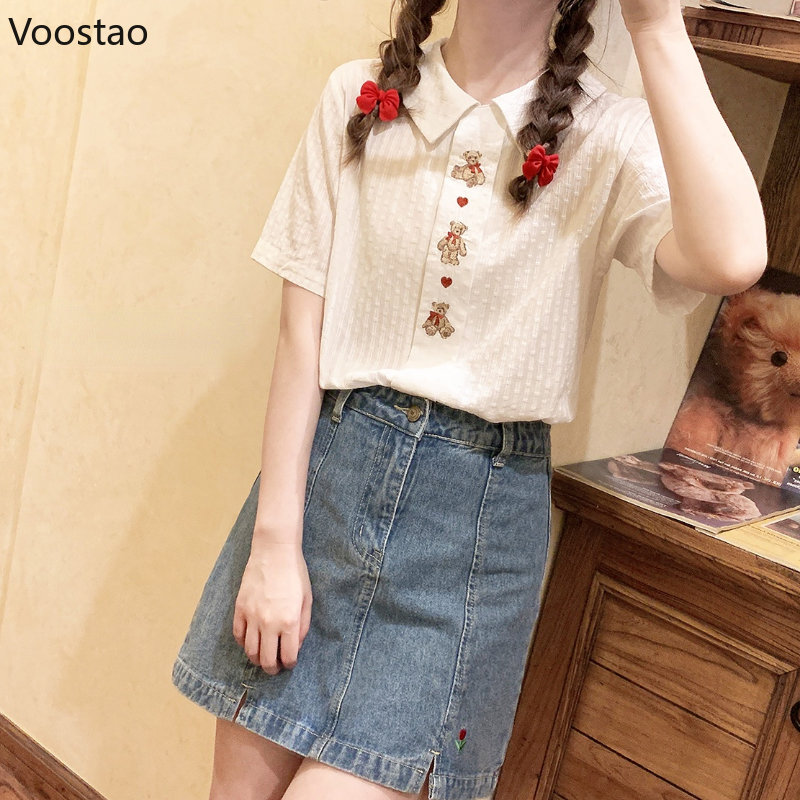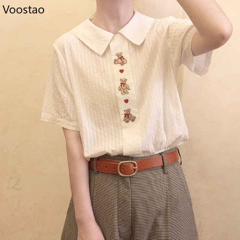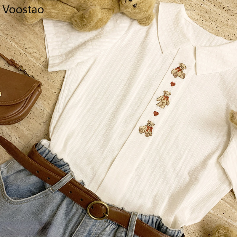 Sweet White Lolita Style Blouses Women Kawaii Cartoon Bear Embroidery Cotton JK Shirts Korean Girly Cute Loose Short Sleeve Tops