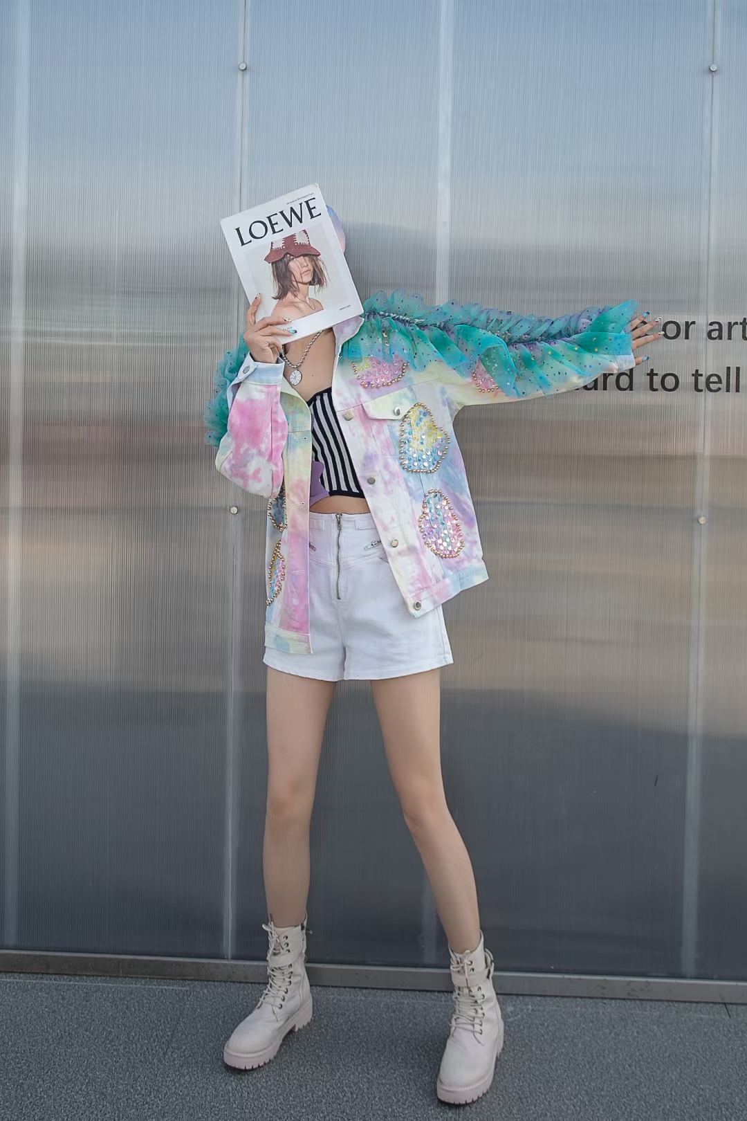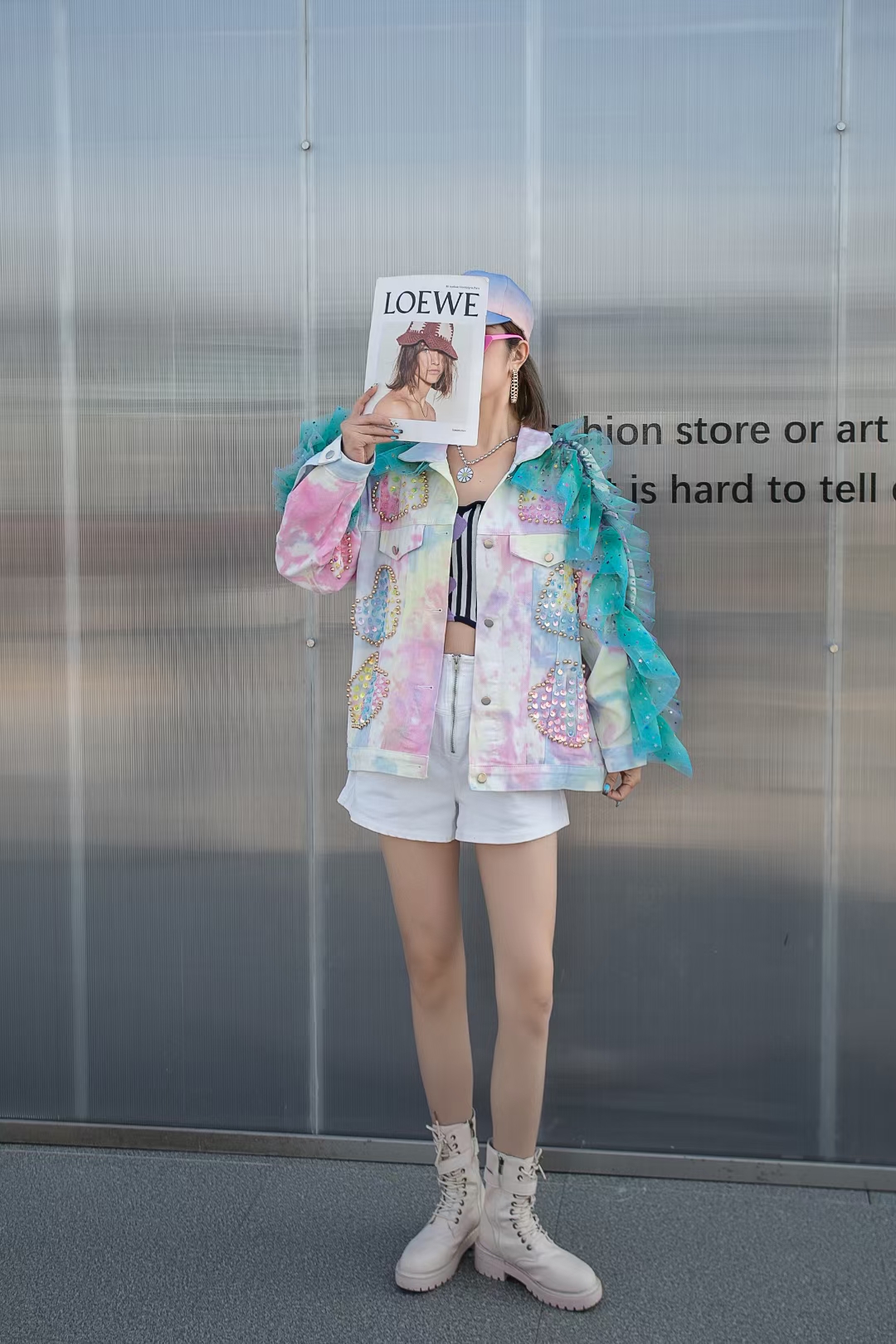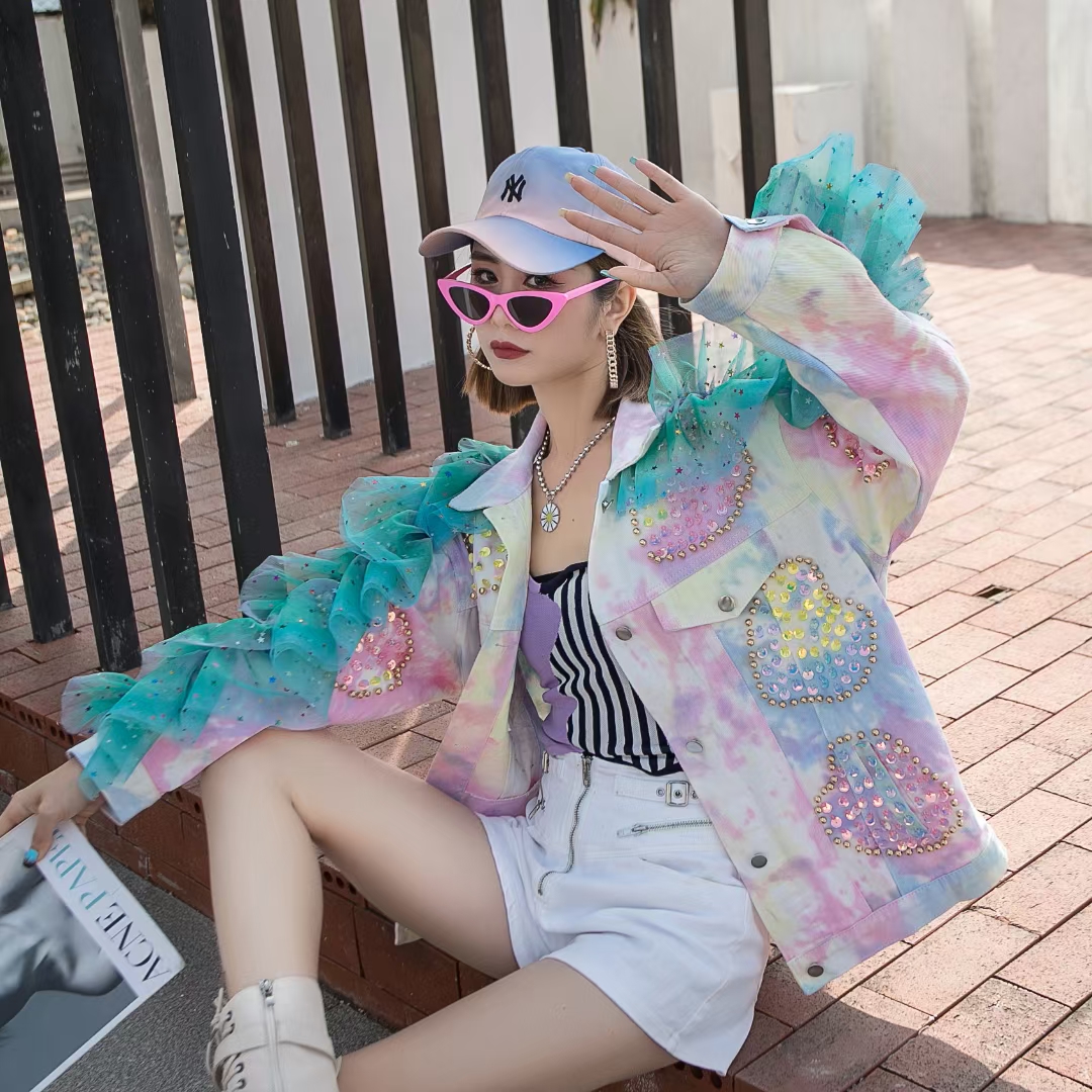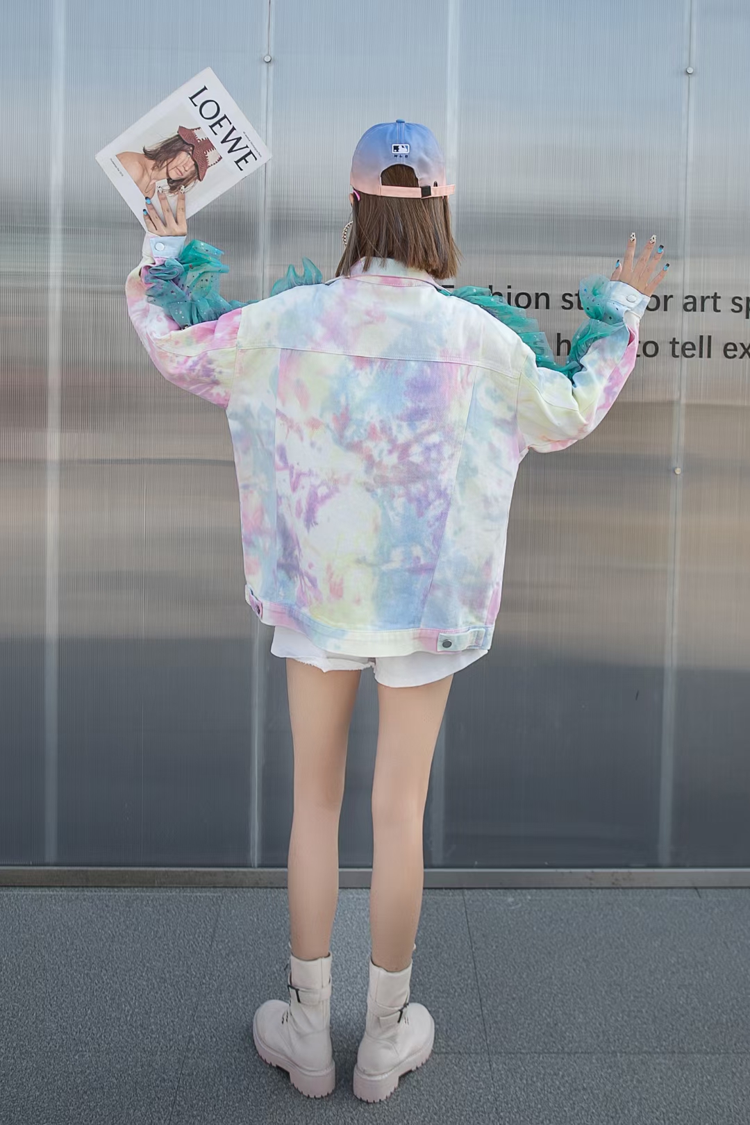 Thailand Fashion Tie Dye Denim Coat Women Heavy Industry Color Sequins Splice Lace Top Spring and Autumn Loose jackets