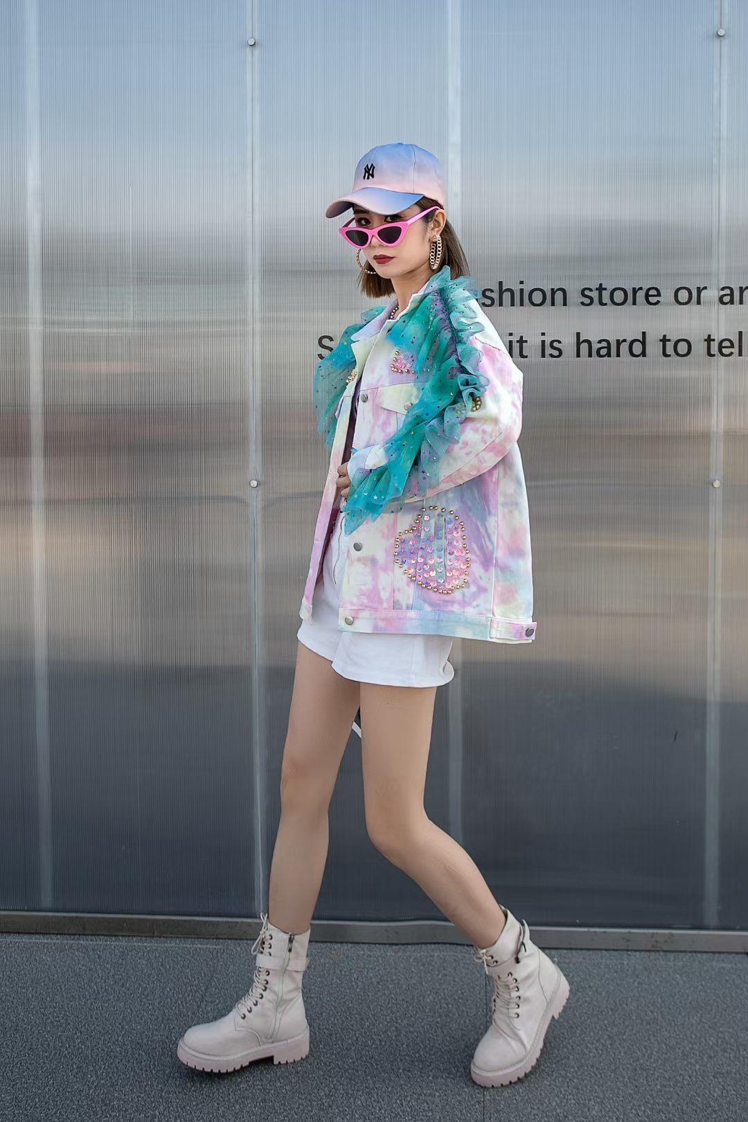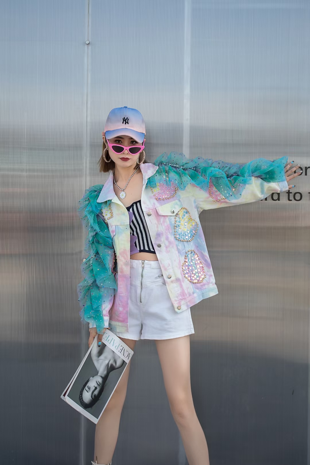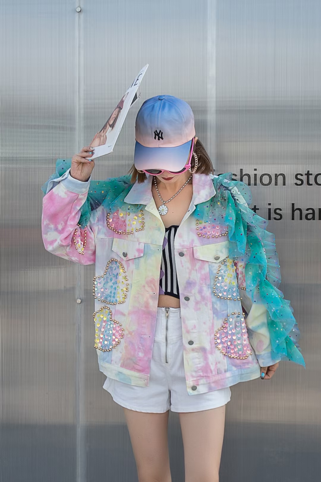 Thailand Fashion Tie Dye Denim Coat Women Heavy Industry Color Sequins Splice Lace Top Spring and Autumn Loose jackets