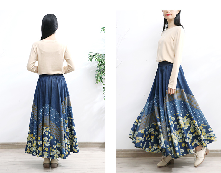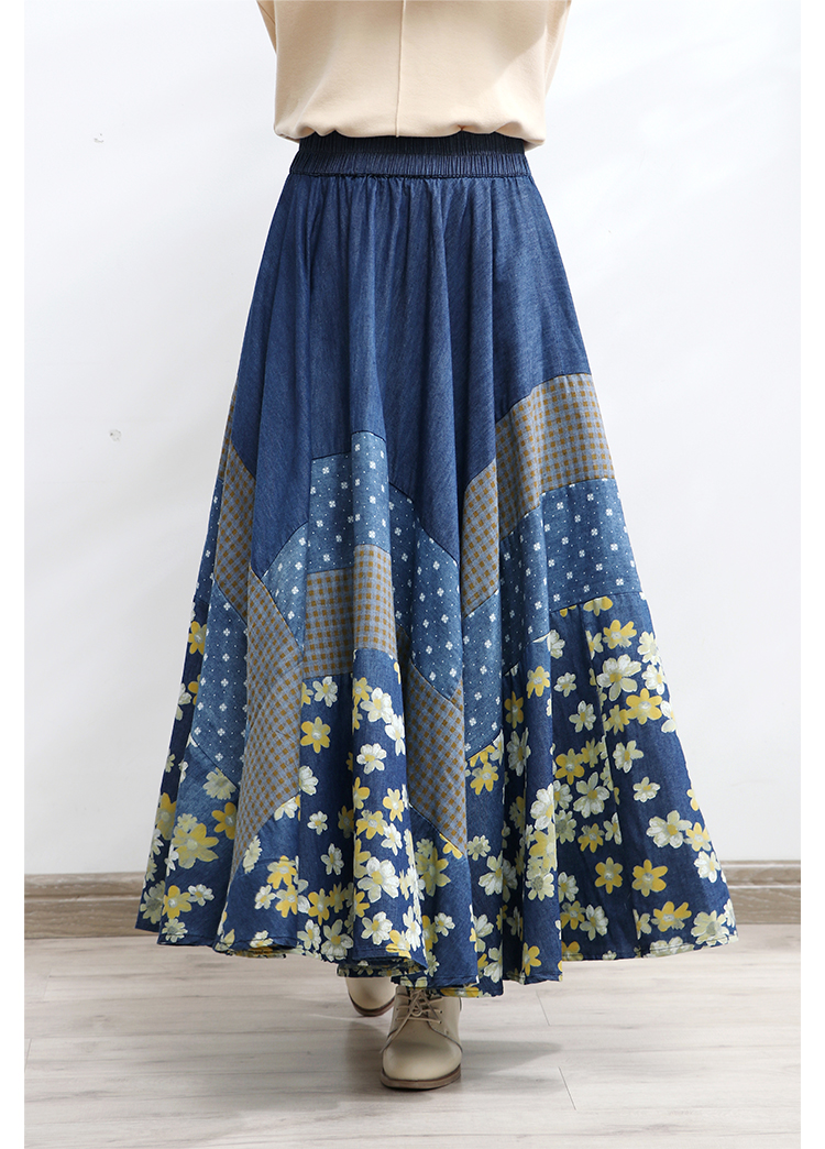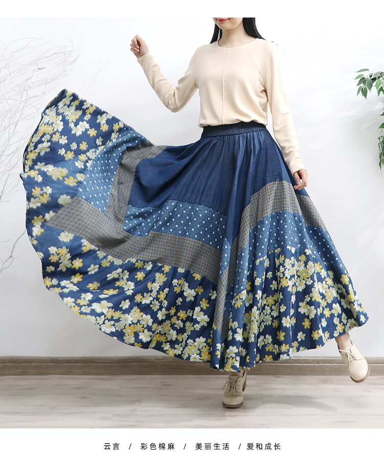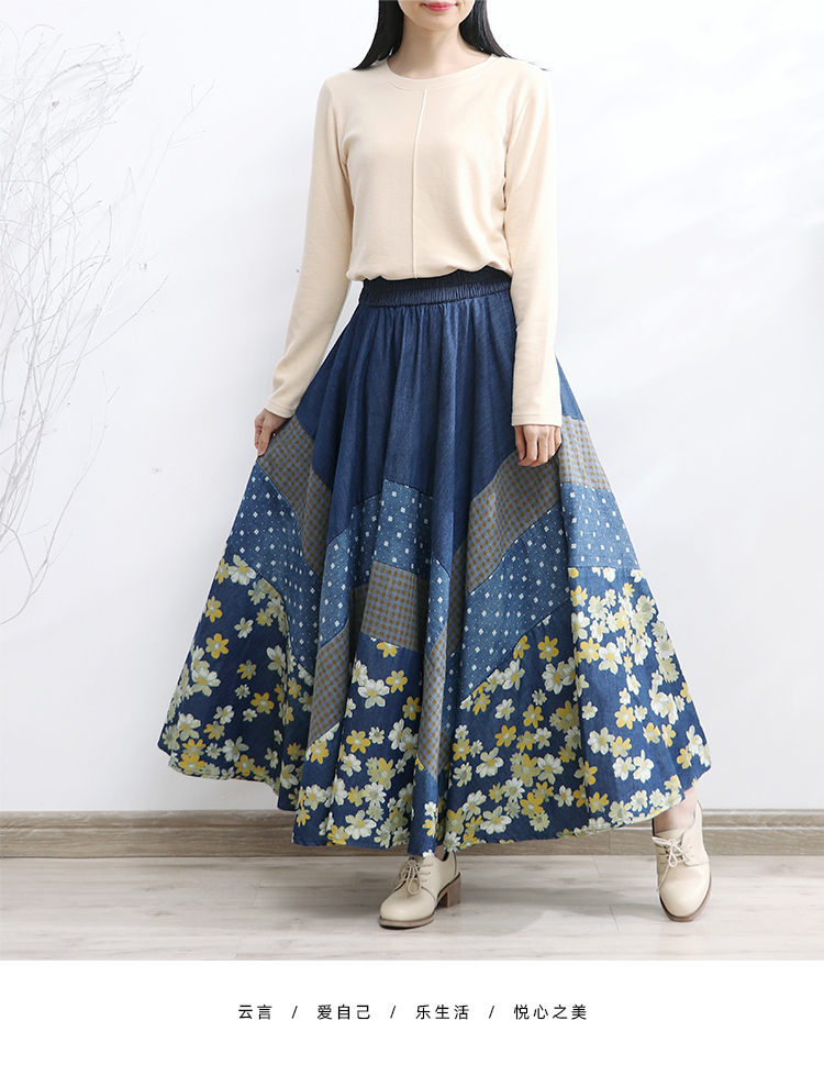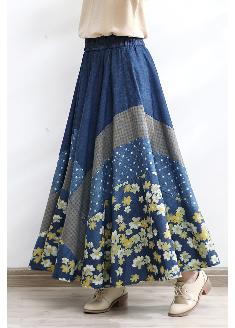 TIYIHAILEY Free Shipping 2022 New Long Maxi A-line Skirt Women Elastic Waist Winter Autumn Denim Jeans Vintage Big Hem Print