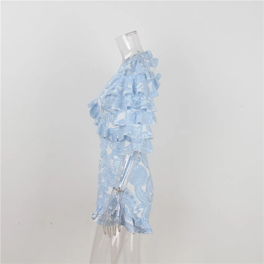 V-neck Sexy Holiday Backless Ruffle Playsuit Rompers Womens Beach Blue Jumpsuit Vocation and Beach Overalls for Women