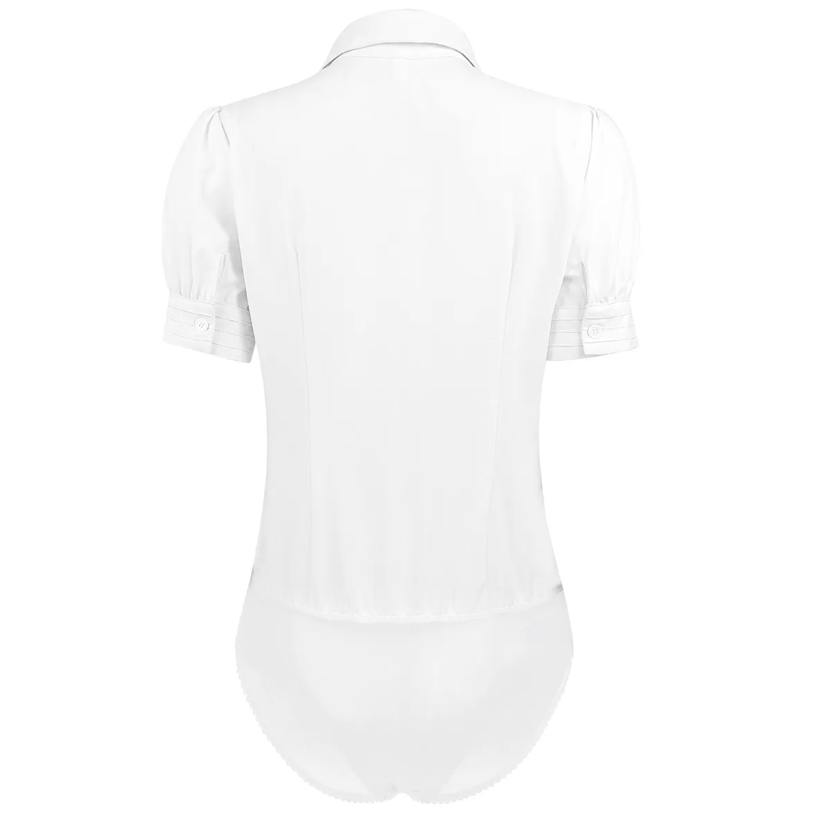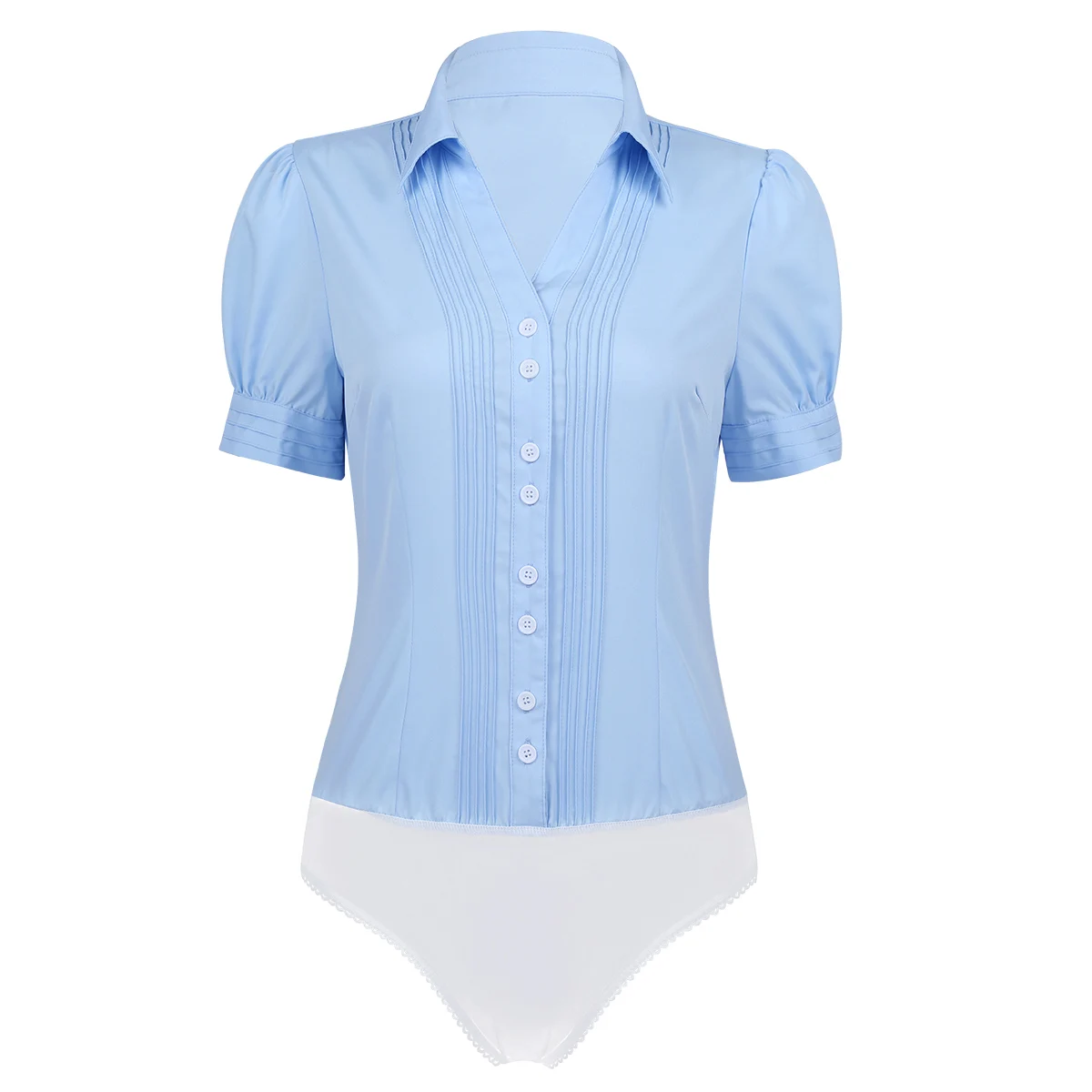 Women Girls Business Work One-Piece Turn-down Collar Front Ruffled Button Down Casual Career Shirt Party Dating Bodysuit Blouse