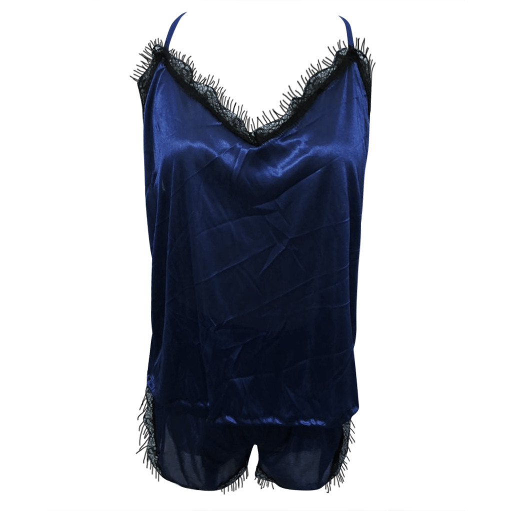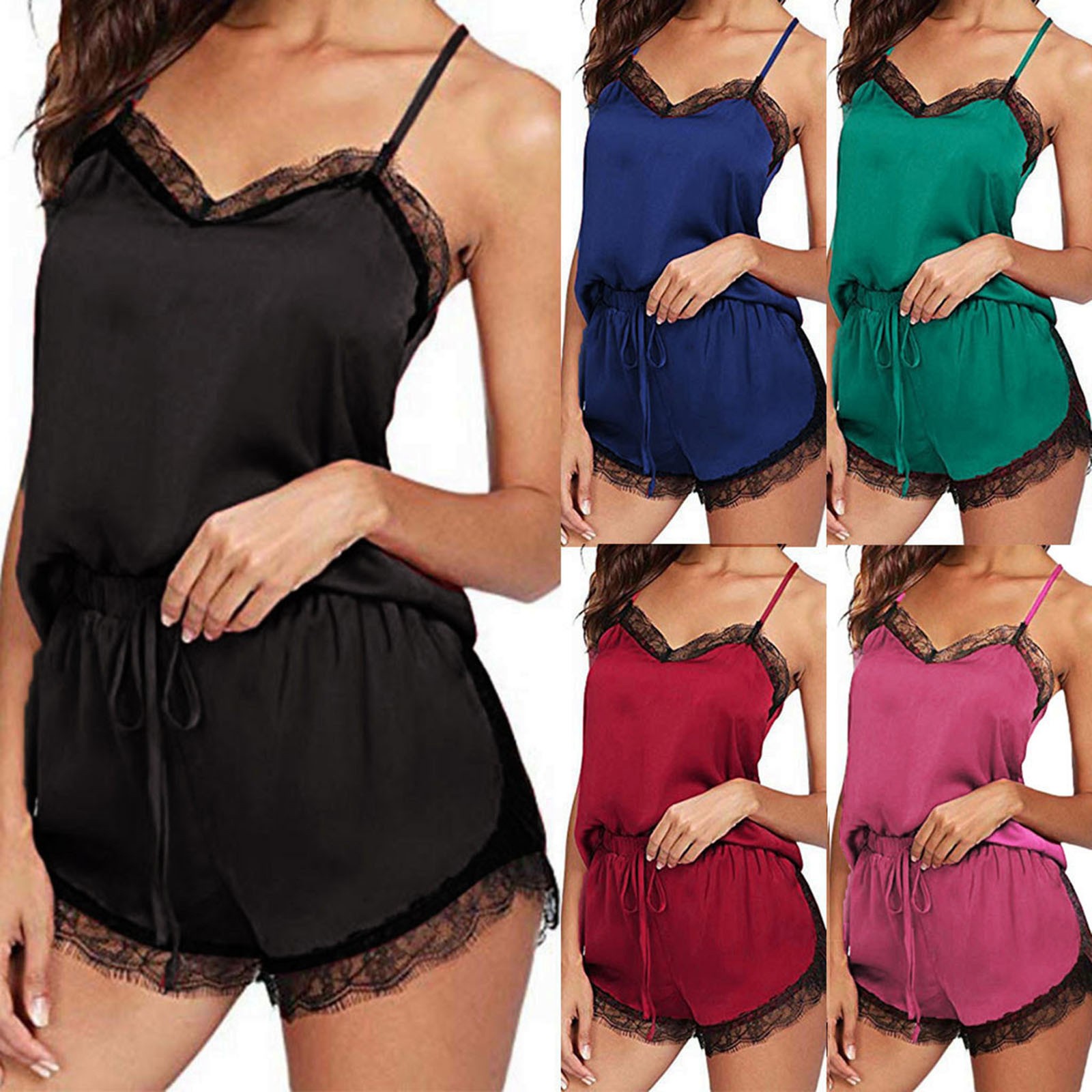 Women Sleepwear Sleeveless Strap Nightwear Lace Trim Satin Cami Top Pajama Sets